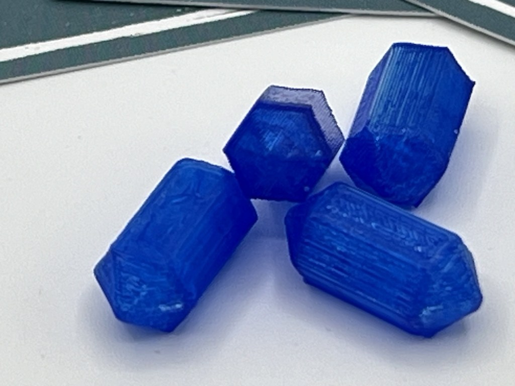I liked the end result, but it didn’t look enough like the game tokens, so I added a draft angle to the extrusion to create an asymmetrical version. The model was great, but I ran into a couple problems printing them. Because the top surface was now angled, printing with 0.2 mm layer height resulted in very visible ridgelines.