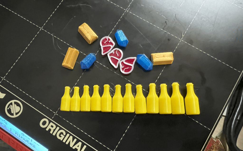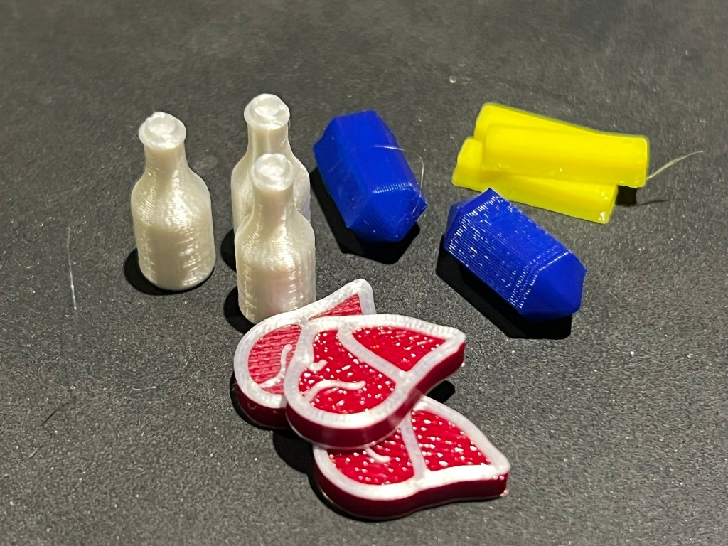 The first prints came out remarkable well. The small ridges between passes of the extruder even give the steak a muscle fiber appearance. I like the shape of my meat resources better than the original image on the token and other 3d models I’ve seen available. Of course that’s just my opinion.