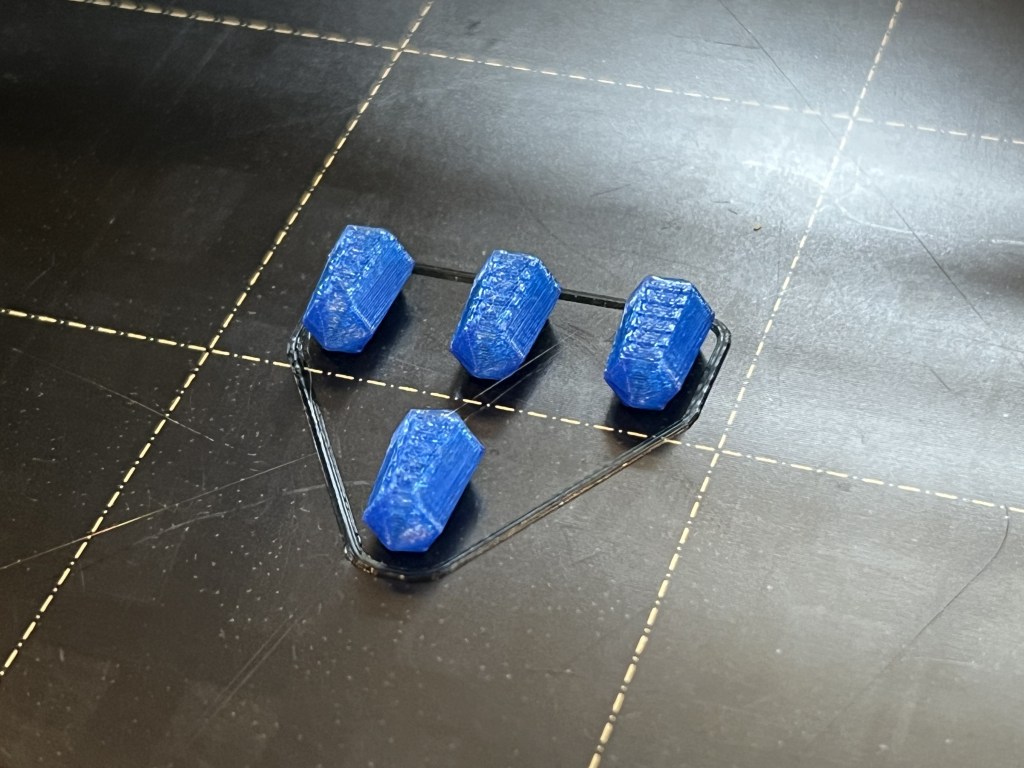 After reducing the layer height, I had adhesion issues and a number of failed batches. To start, I was only printing four at a time, so the failures happened pretty quickly and I was able to adjust the temperature settings of the hot end and the print bed. Eventually I was able to dial in settings that worked and printed two batches.