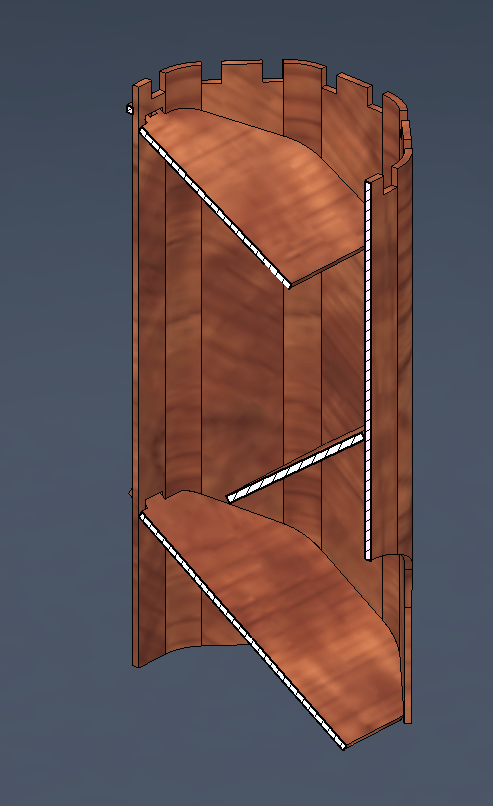 With the model in its bent shape, I added the shelves, cut away the doorway, added tabs to the shelves and cut away from the towers to slot the tabs. Because the laser cutter only cuts perpendicular to the material, I had to compensate for the angles of the tabs in the slots I made.