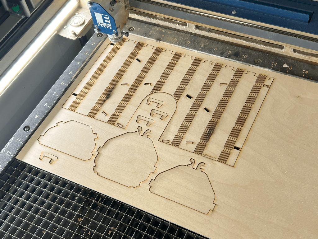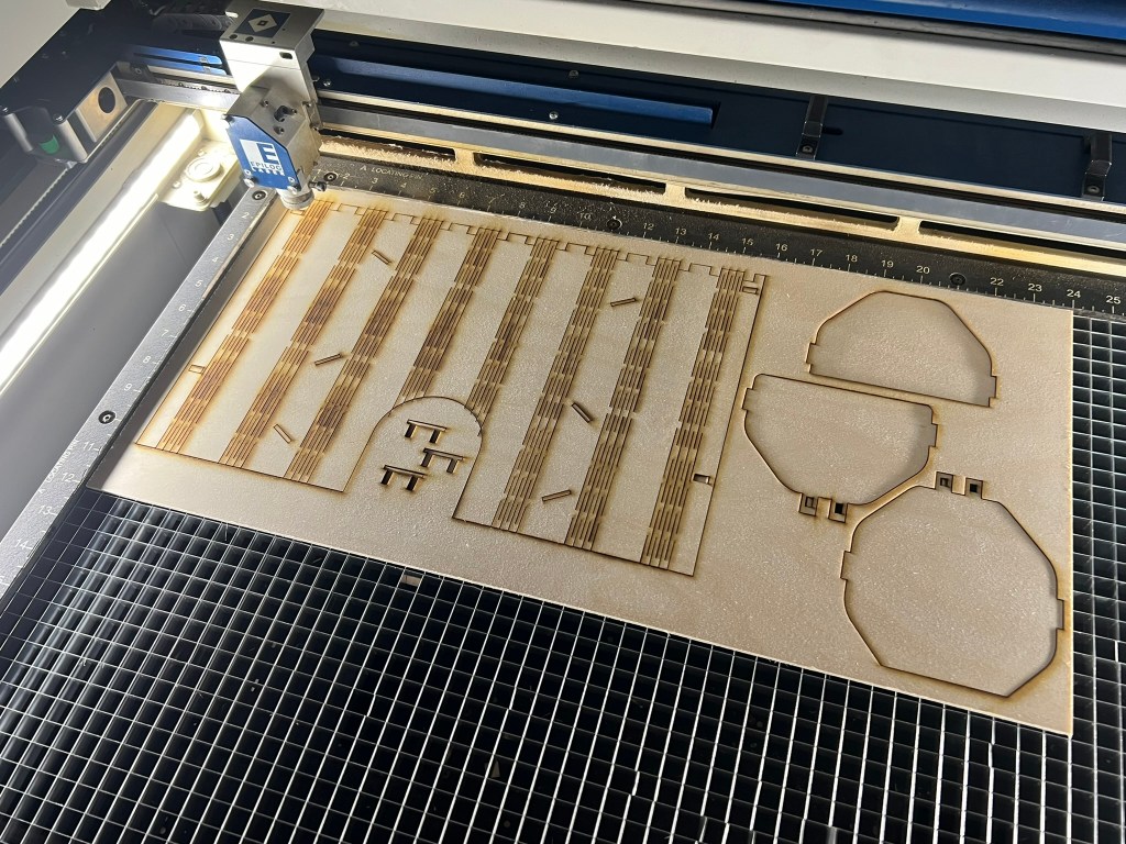 So, while on vacation, because I enjoy this kind of thing, I started making design improvements. First thing I did was shrink the design to be about the size of a D&D book. This is way more than simply scaling the model, as all the tabs and slots are dependent on the thickness of the plywood which wasn’t changing and the living hinges are dependent on spacing between the cuts. I’ll write more in the next segment of this design journey.