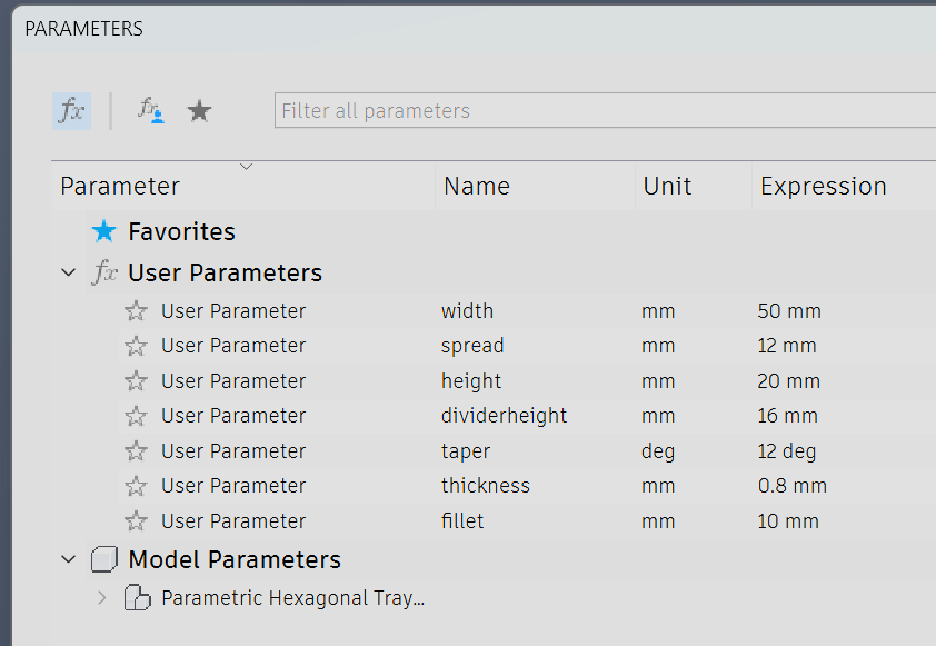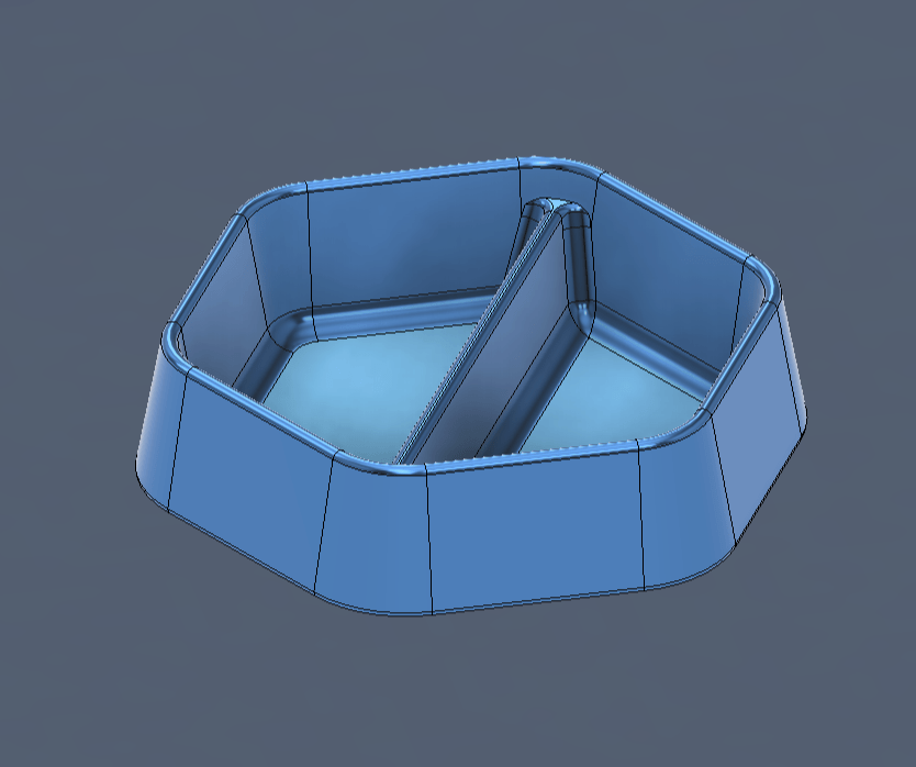 I used the taper angle on the extrude command to give me the shape I wanted and able to very quickly replicate the hexagonal single compartment tray. Next, I added the divider using the same sketch, extrude with taper command.